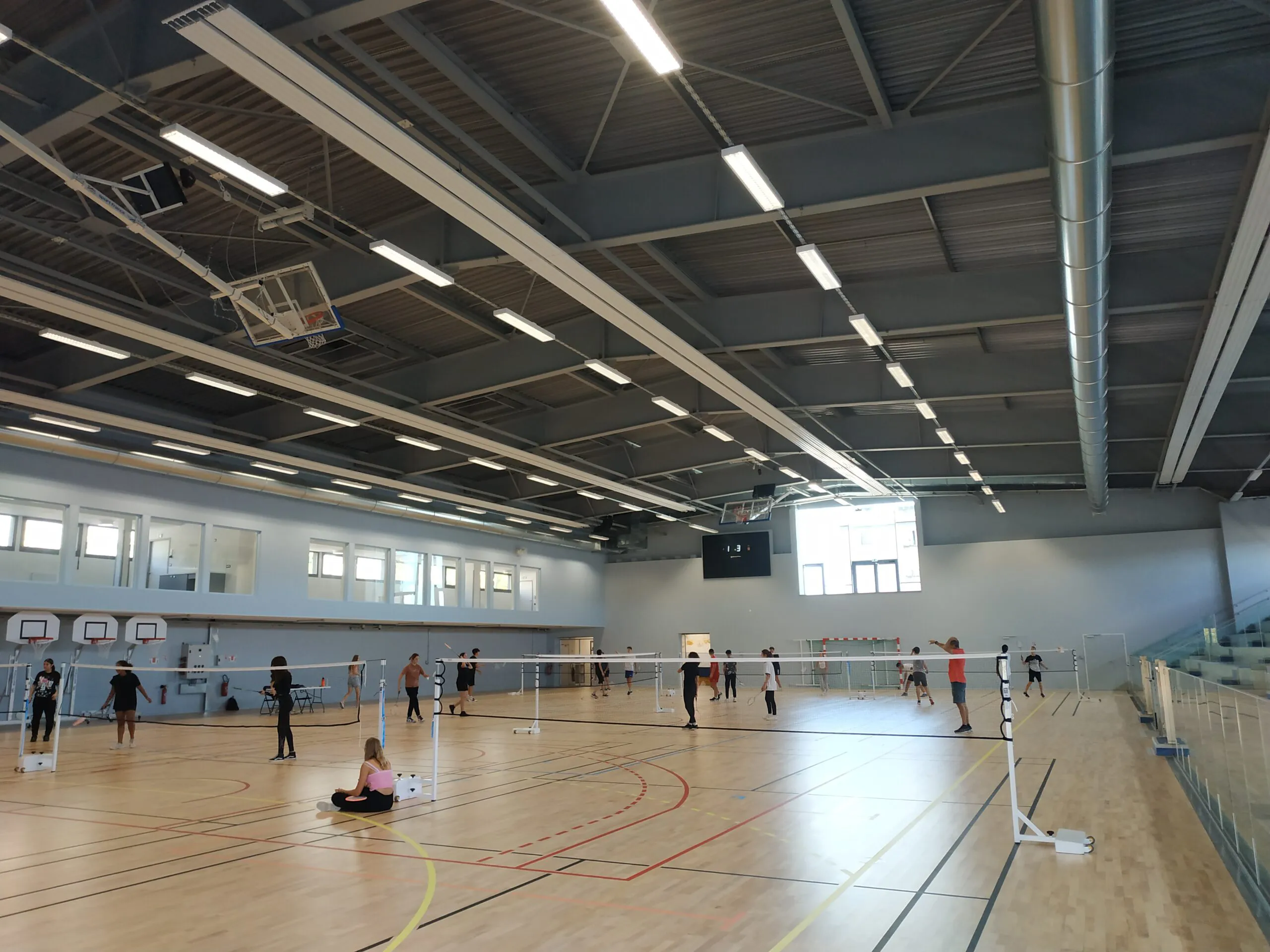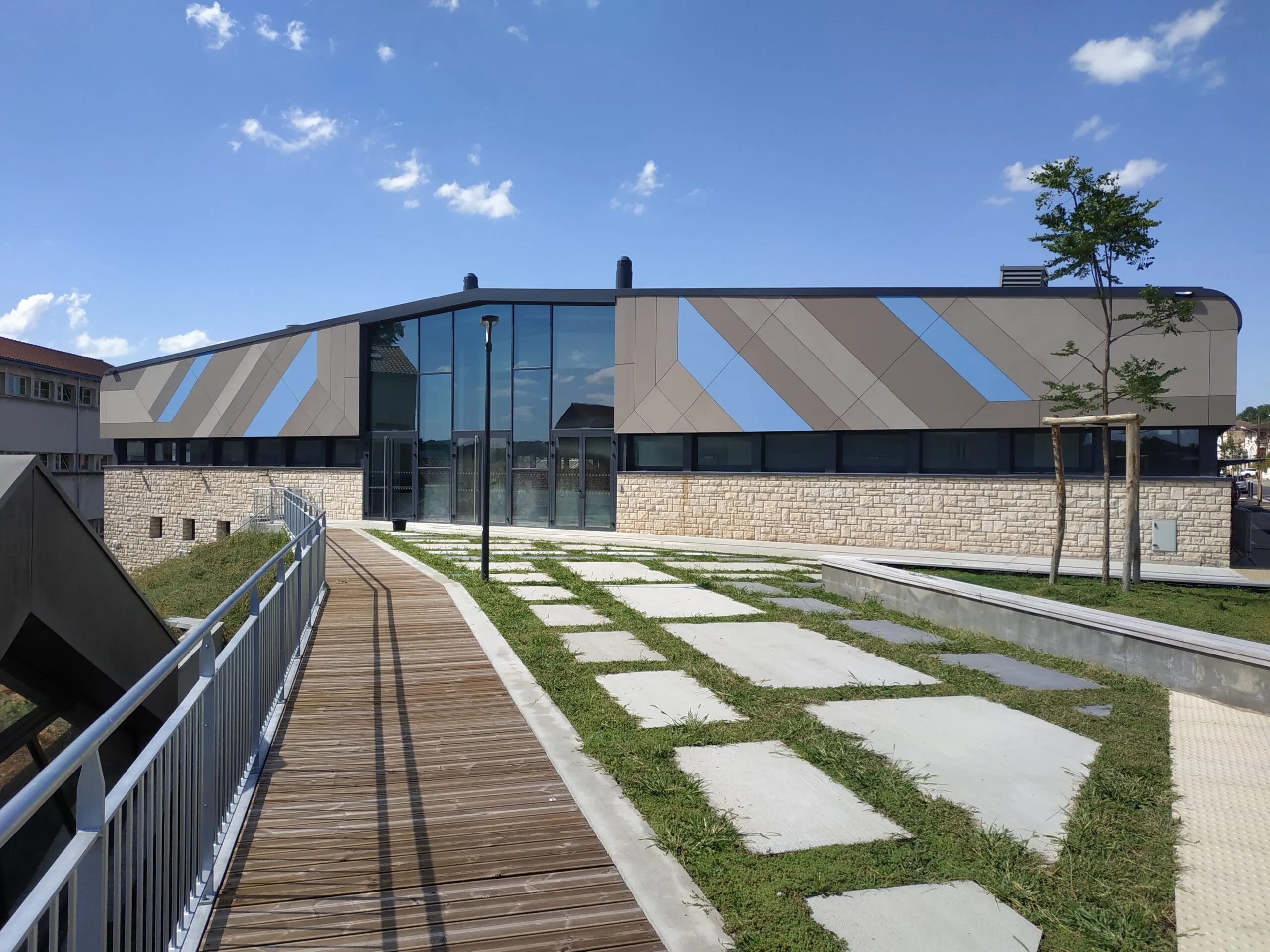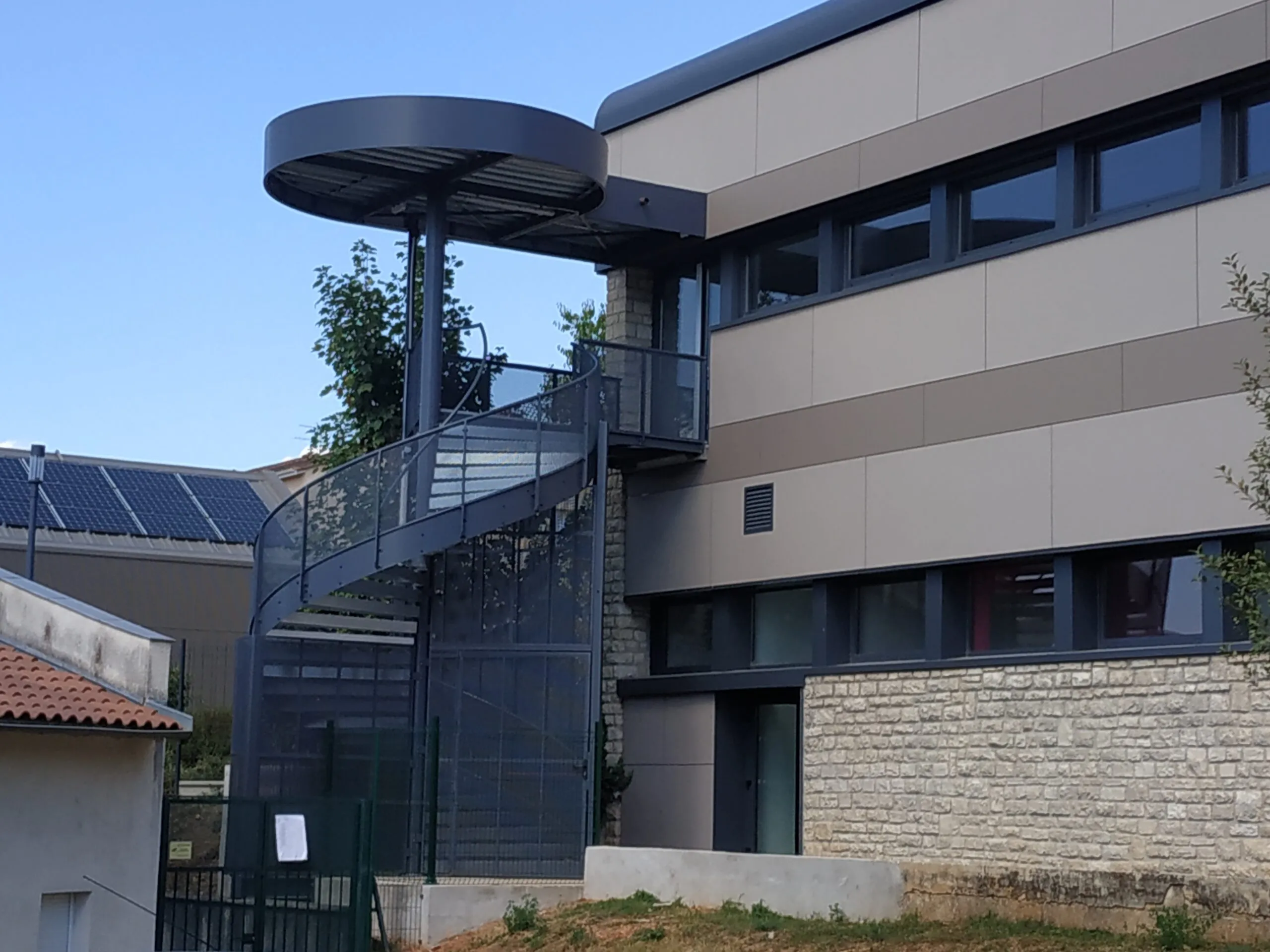 Charpente métallique du Gymnase de Clos Chassaing pour le compte de la Mairie de Périgueux. Au total, c’est 70 tonnes de charpente dont 40 en PRS. Escalier hélicoïdale sur mesure.